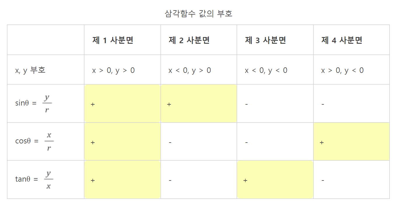 sinθ = y/r , cosθ = x/r , tanθ = y/x 로 나타낸다.